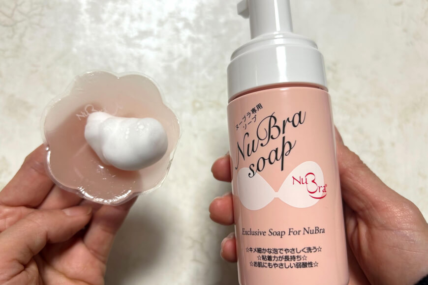 ヌーブラ専用の洗剤を使用し、放置しておくだけで、変わらない粘着力を保つことができます。手持ちの中性洗剤などで洗ってしまいたいところではありますが「粘着力が損なわれてしまう」とのことでしたので、長持ちさせるためには専用の洗剤を使用してください。