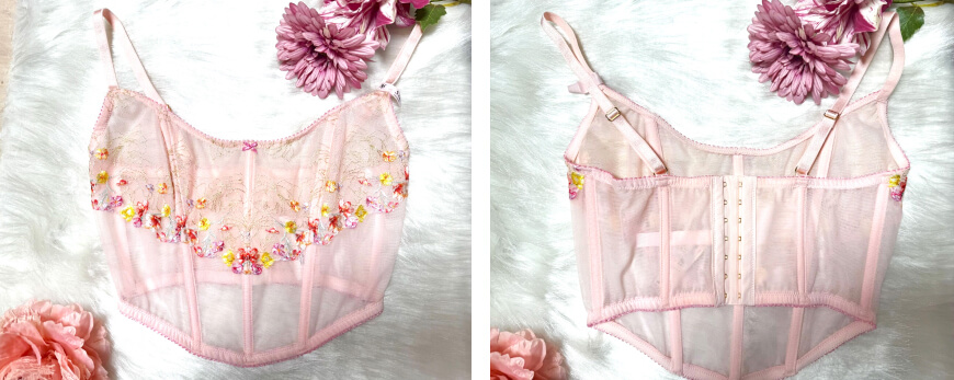 淡いピンクのチュール地に、赤や黄色、紫の花々を立体的に刺繍したビスチェは、まさに “海外ランジェリー” ならではの華やかさ。繊細な透け感と花の彩りが重なり合い、可憐さと凛とした存在感を同時に演出してくれます。