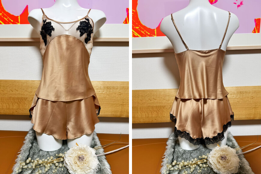シルクのような艶やかなシャンパンゴールドに、胸元のブラックレースが大胆に配置されたキャミソールとタップパンツのセットアップ。リゾートホテルの夜に纏いたい、まさに「大人のランジェリー」です。